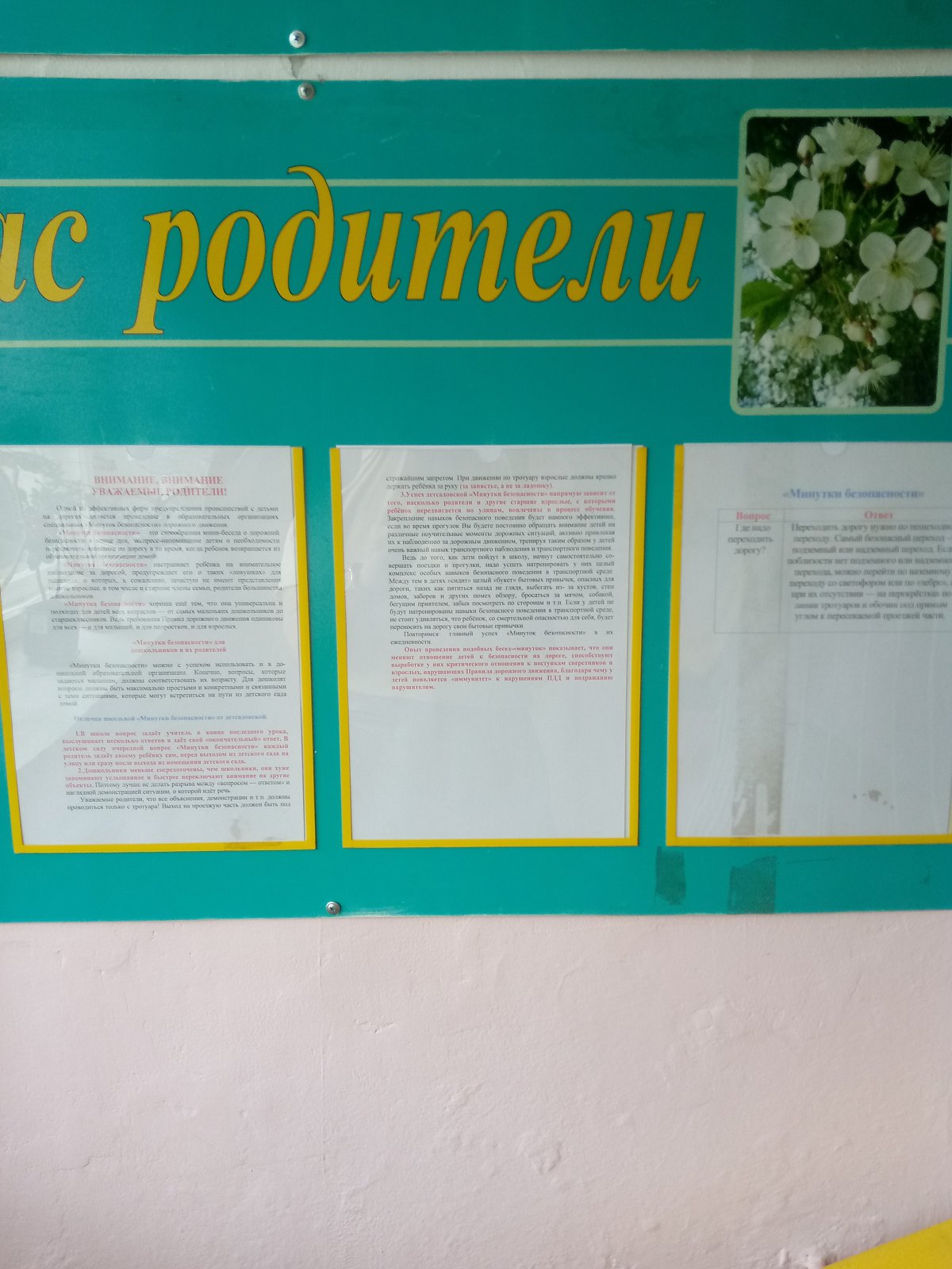 На групповых собраниях педагоги рассказали родителям о необходимости соблюдения правил дорожного движения. Были предложены различные памятки: «Осенний период и дороги», «Родители – водители». Также для родителей на стенде «Это важно!», вывешиваются «Минутки безопасности». Проведена Акция «Опасности на дороге» ( родителям раздавались буклеты о правилах поведения на дорогах».
