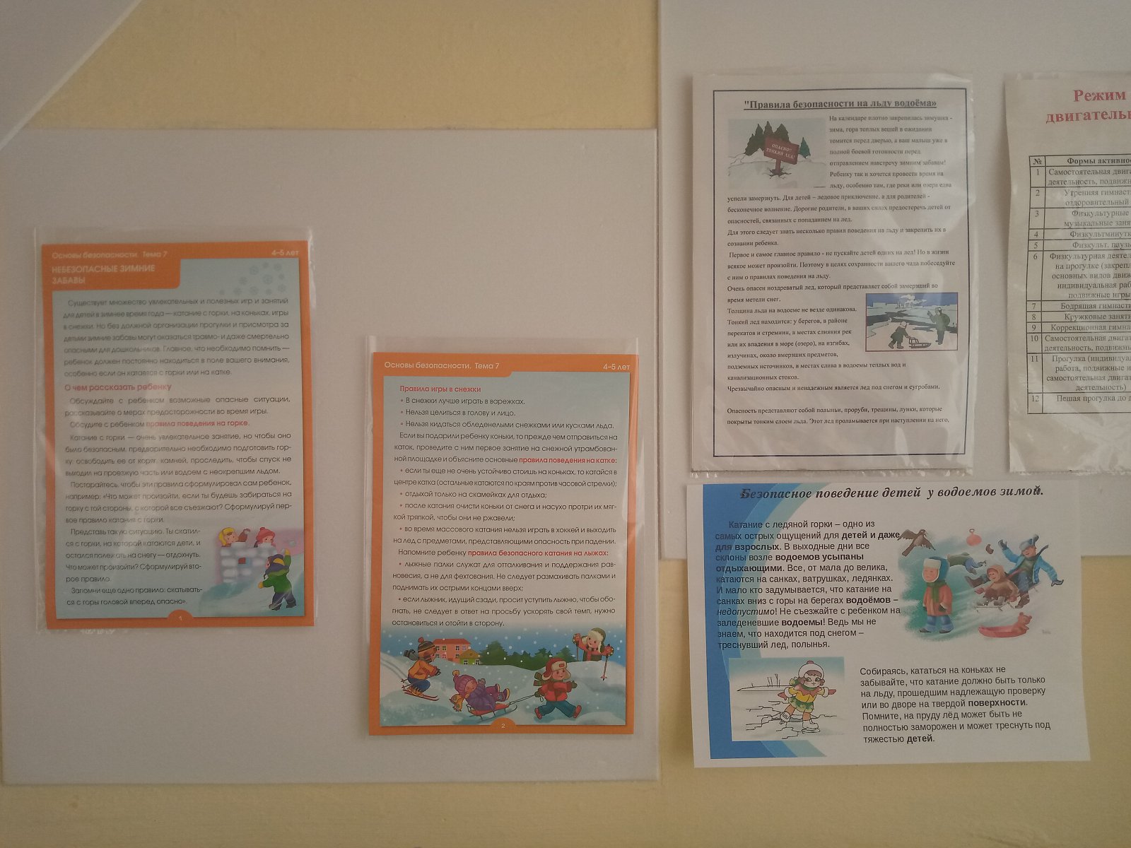 Для родителей воспитатели подготовили и оформили информационные материалы на стендах в группах и в дошкольном учреждении: «Меры безопасности на льду», «Правила безопасного поведения на водных объектах во время ледостава и в зимний период», «Внимание, тонкий лед!»,.