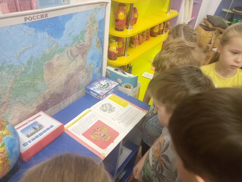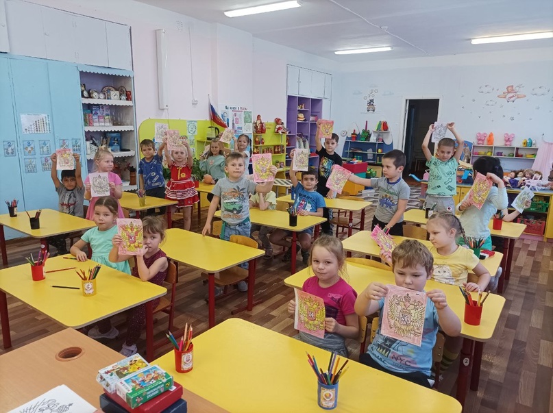 С детьми провелась беседа о Государственном гербе России, ребята рассмотрели изображения с символикой России, узнали об истории герба России, его символическом значении, просмотрели мультипликационный фильм «Сказка о двуглавом орле», из которого узнали почему у орла две головы; раскрашивали герб.А перед началом занятия дети прослушали государственный гимн России.