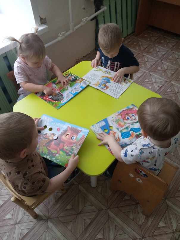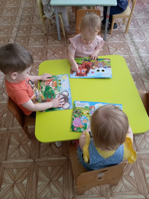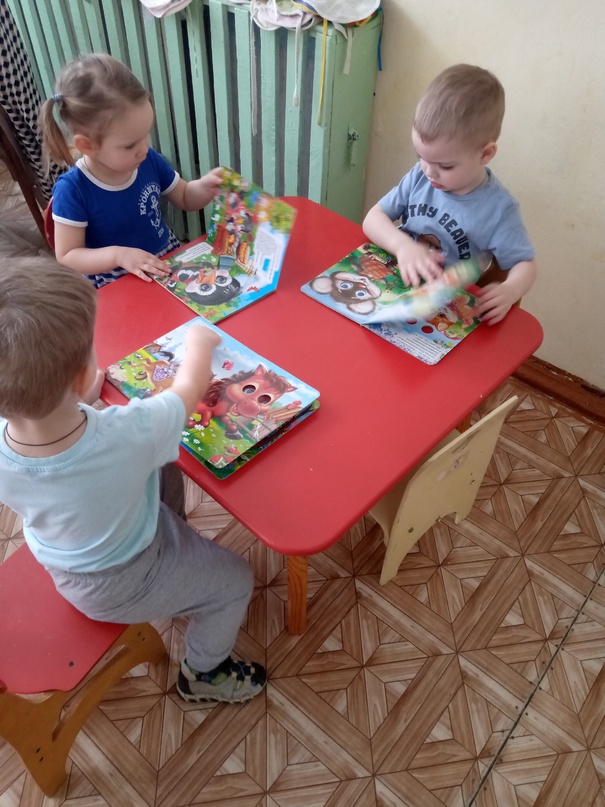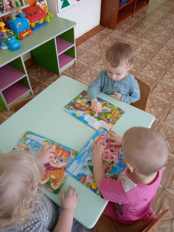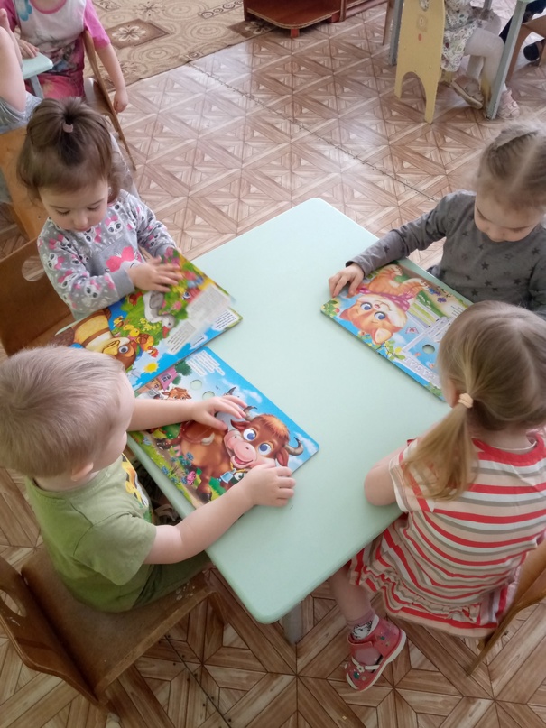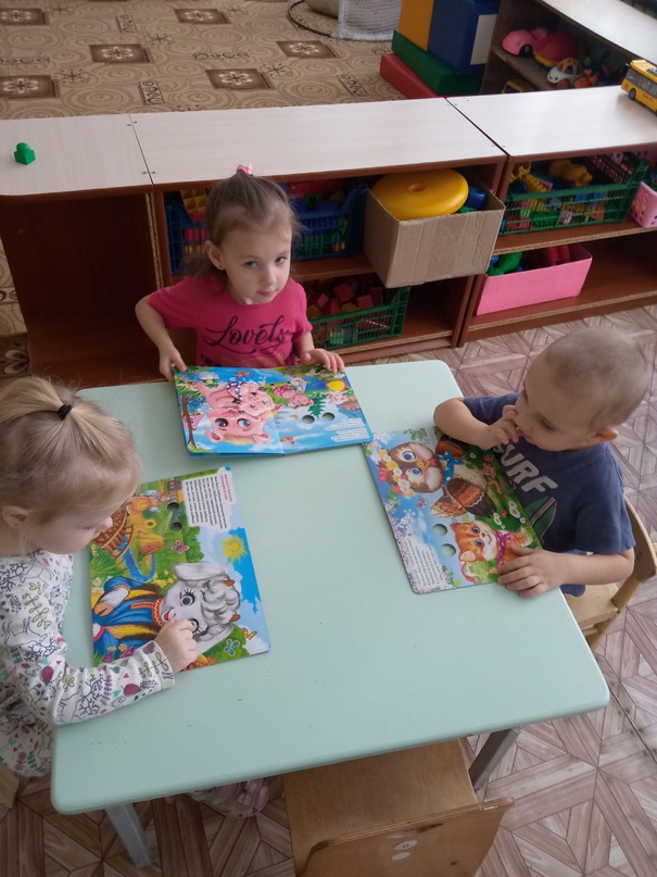 А потом в группе детки рассматривали книжки с "глазками" и очень яркими и красивыми иллюстрациями животных и повторили как же "разговаривают" разные животные.