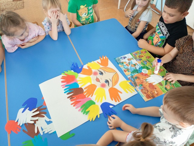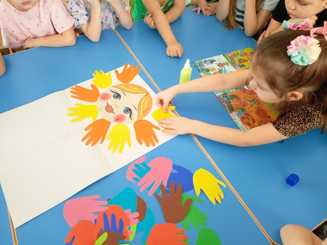 Ребята группы «Сладкоежки» выполнили групповую аппликацию «Кукла Масленица» из своих ладошек ????